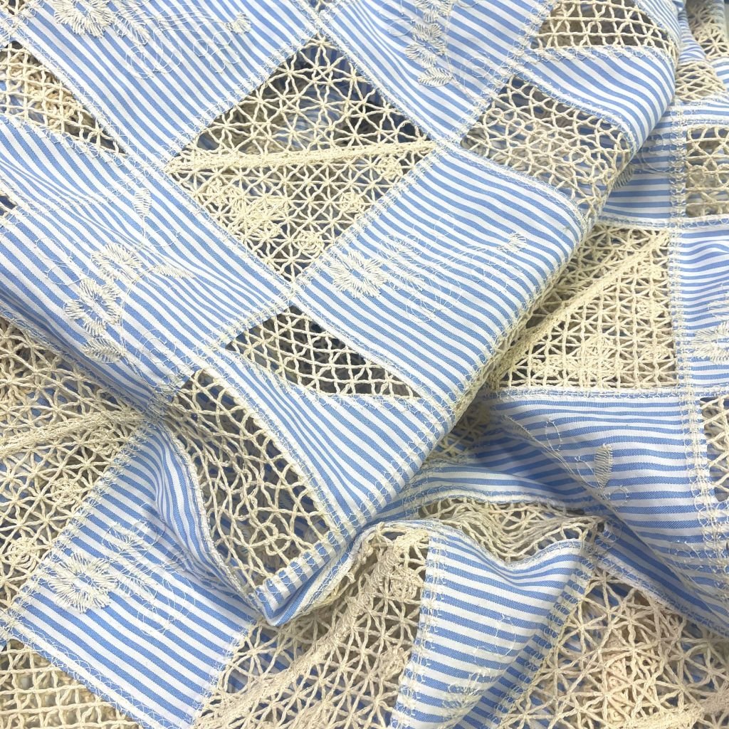 Тонкая смесовая ткань с интересным принтом из вставок с льняной вышивкой. Хорошо впитывает влагу, комфортна при носке. Держит форму. Прекрасно подходит для пошива платьев, сорочек, одежды в спортивном и романтичном стиле. Особо модная полоска и сочетание фактур позволит не только сшить изделие классической формы, но и поэкспериментировать с геометрией рисунка.